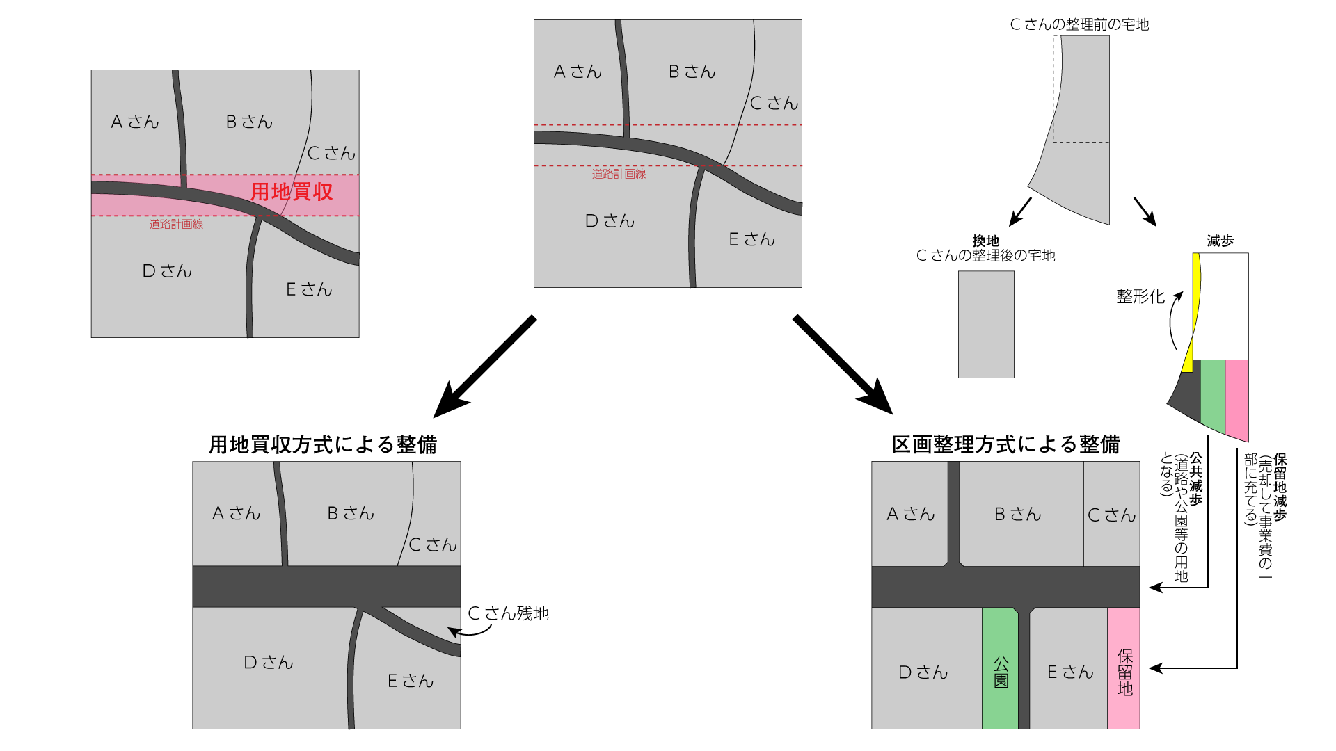 土地区画整理事業は、地権者から少しずつ土地を出し合い(減歩)、道路や公園などの公共施設を整備し、合わせて土地の形を整えて、良好な市街地を整備する事業です。