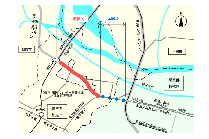 とされていましたが、実際に都市計画決定されたのは、区間①と区間②の埼玉県内区間のみで、区間②の東京都区間は都市計画変更されていません。