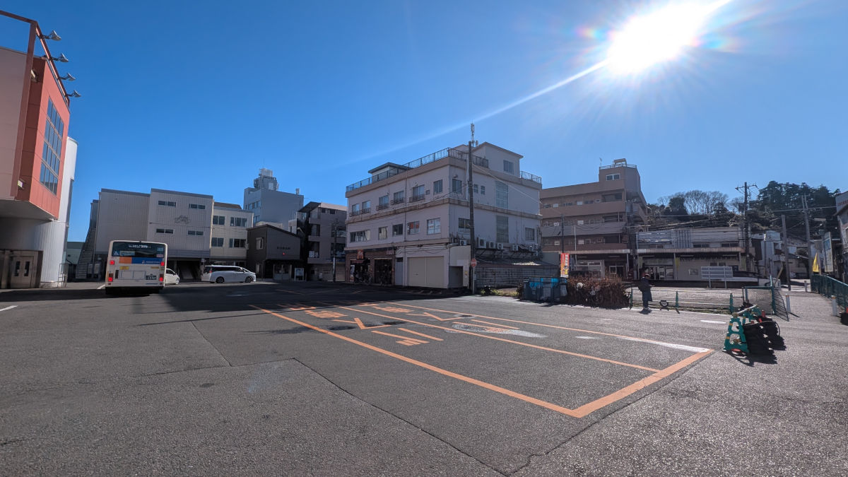 駅前広場にはバスも乗り入れ、比較的広い広場が広がっています。一方で、広場には歩道が無く、通行空間も区別されていません。