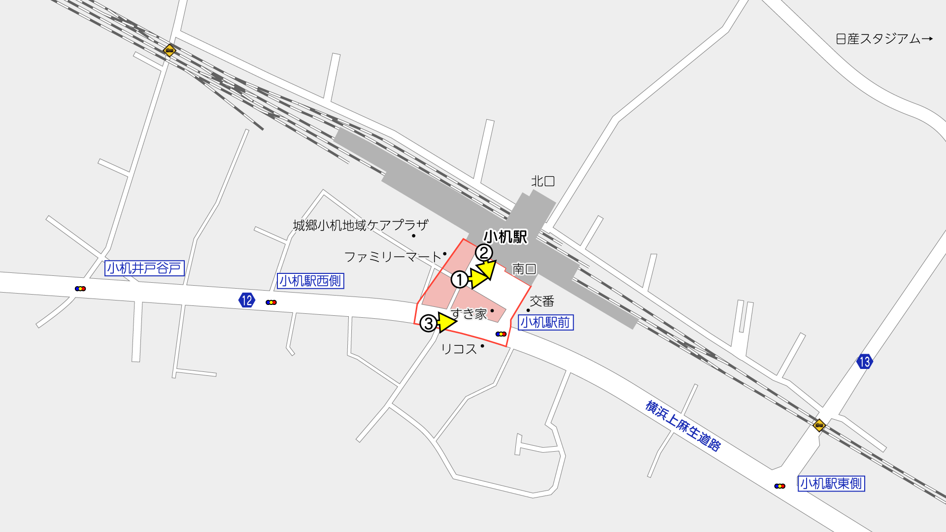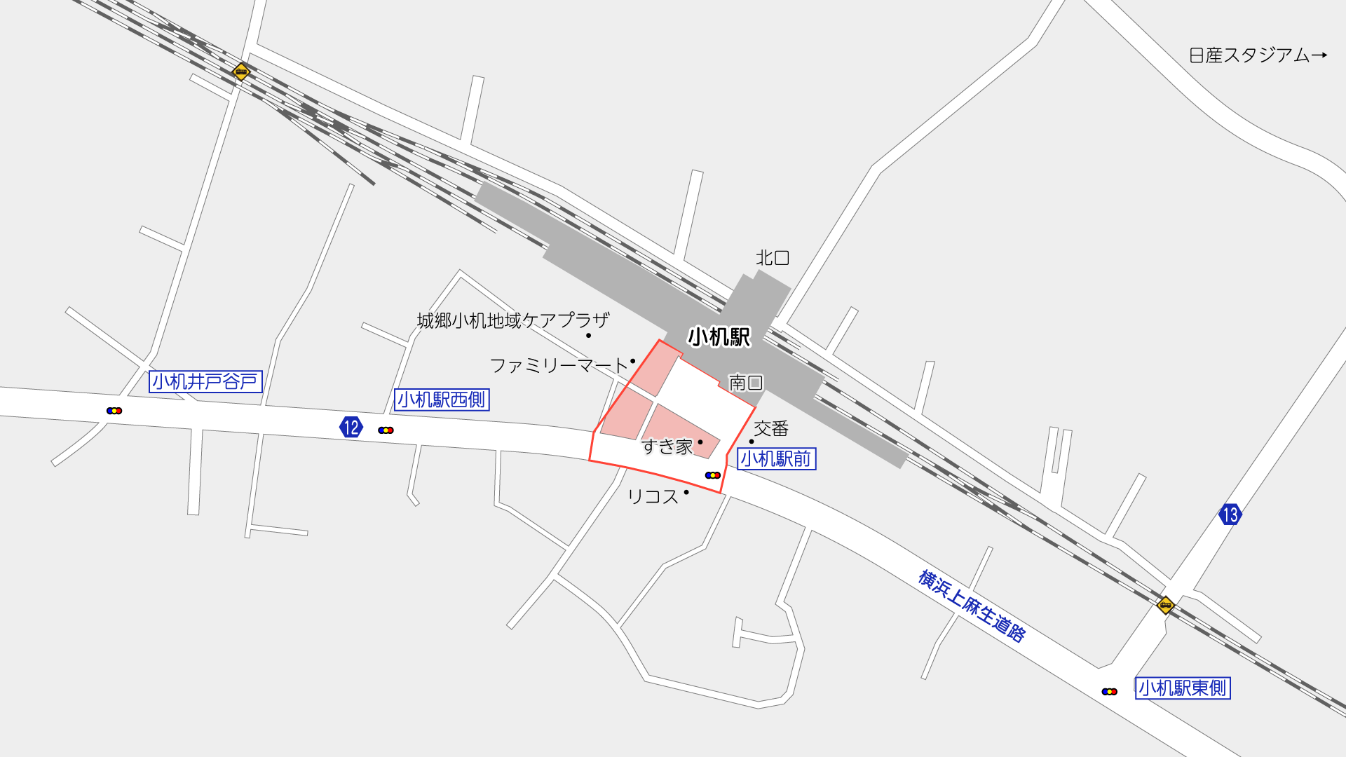 横浜国際港都建設計画道路3・3・32号横浜上麻生線は、横浜市神奈川区東神奈川一丁目から横浜市青葉区鉄町に至る延長約16,080mの都市計画道路です。このうち上記図に示した小机駅南口では、交通広場等を整備する事業が行われています。
