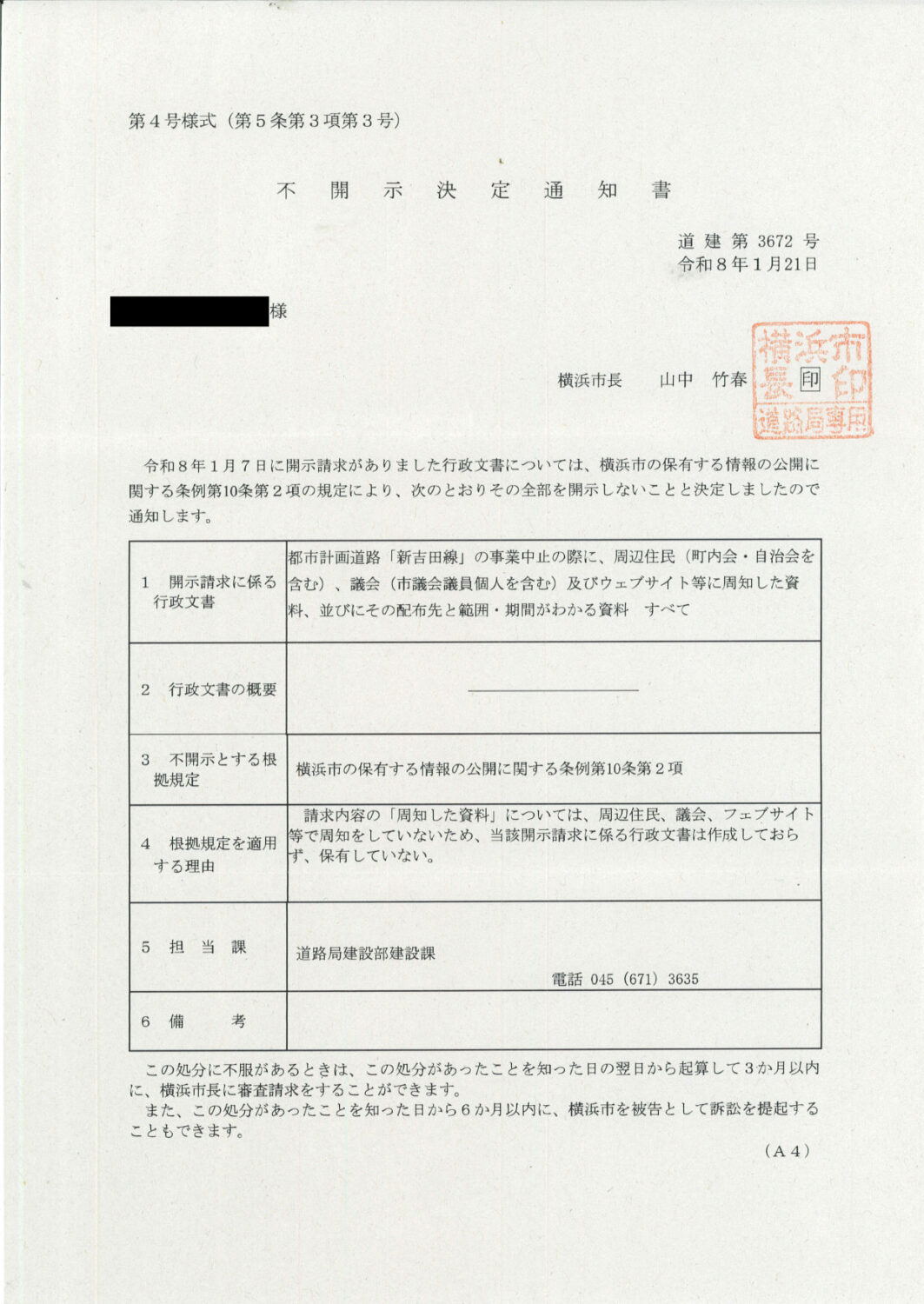 そのほか新吉田線についてインターネットで調べても中止についてヒットしなかったことから、地元周知の資料等を情報公開請求したところ、「不存在」という通知で、中止にあたり地元説明は、市議会議員を含めて行われていませんでした。