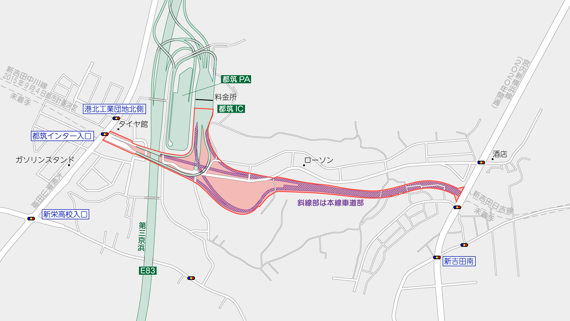 都市計画道路「新吉田線」は、大熊東山田線と交わる都筑インター入口交差点から宮内新横浜線に至る延長約1260mの都市計画道路です。1999年3月5日に都市計画決定されたのち、1999年3月26日に事業認可されていました。