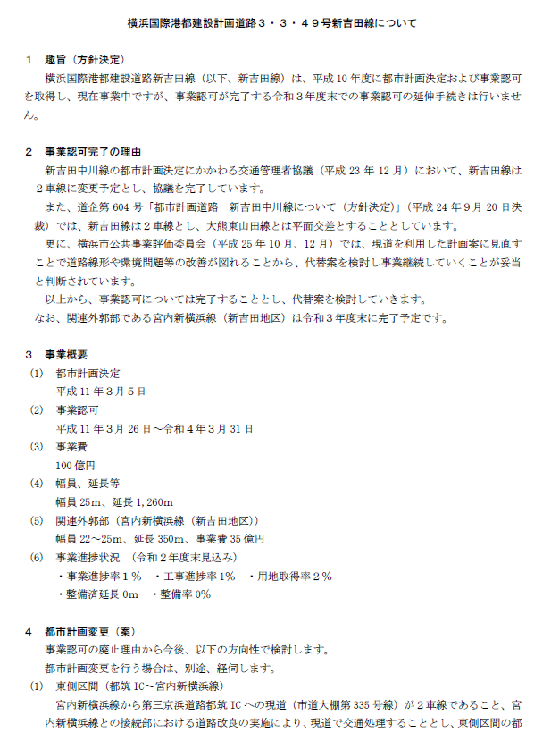 横浜市都筑区及び港北区で事業が行われていた横浜国際港都建設計画道路3・3・49号新吉田線が、事業施行期間の延伸を行わず、2022年3月31日をもって都市計画事業を終了していました。市議会議員を含む市民説明は行われていませんでした。