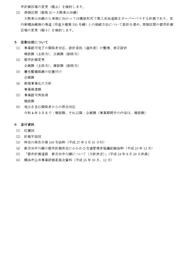 それによると、先述の横浜市公共事業評価委員会の対応方針等を踏まえ、都市計画事業は完了(終了)することとし、都筑IC以東は都市計画変更(廃止)、以西は区域の変更(縮小)することで検討することとしています。