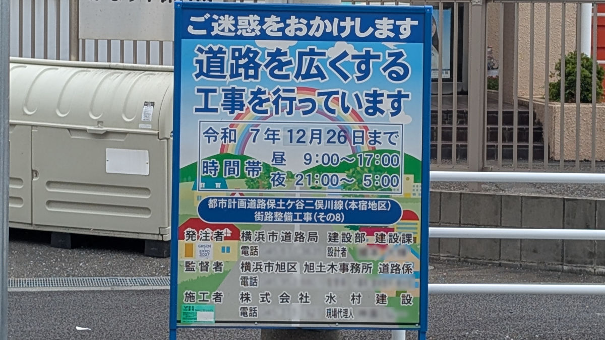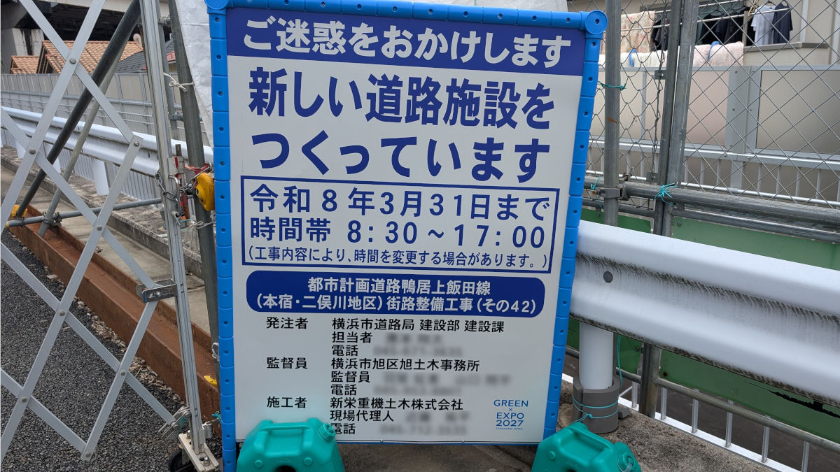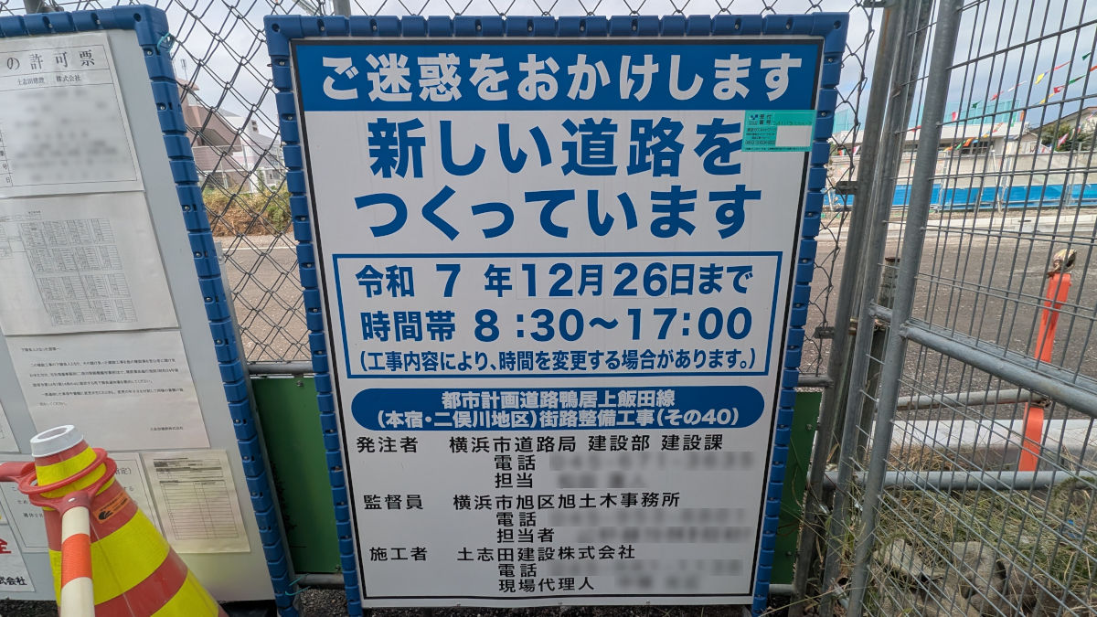 工事件名は「都市計画道路鴨居上飯田線(本宿・二俣川地区)街路整備工事(その42)」で、2026年3月31日までの予定で、新栄重機土木株式会社が施工しています。