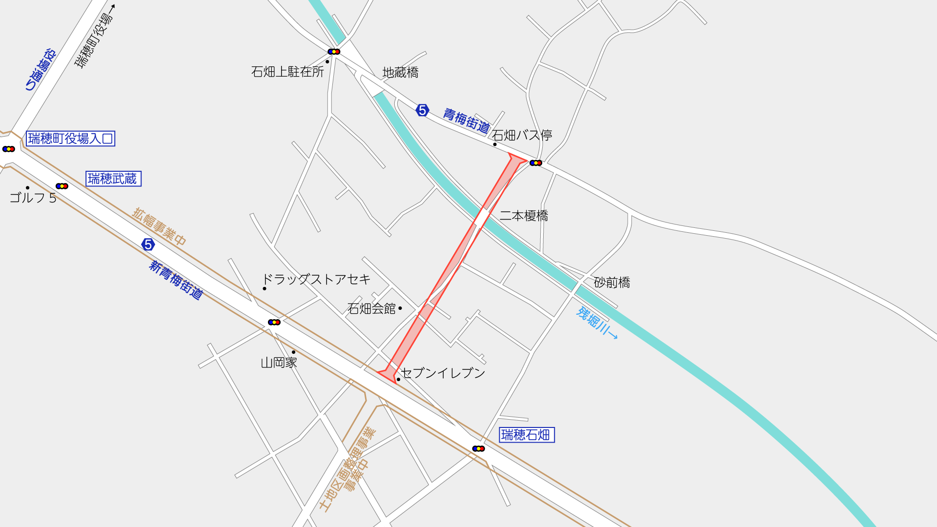 福生3・5・23号石畑中央線は、瑞穂町大字武蔵から瑞穂町大字石畑字丸ケ谷戸に至る延長約1,420mの都市計画道路です。
