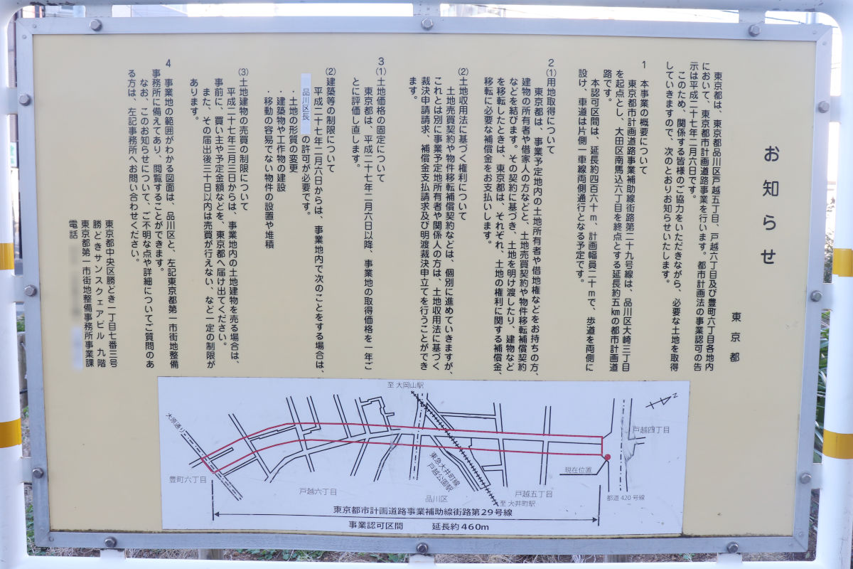 補助第29号線は品川区大崎三丁目から大田区南馬込六丁目に至る延長約5,040mの都市計画道路です。このうち上記で示した都道鮫洲大山線から大原通りまでの区間では、「戸越公園駅周辺地区」として道路を整備する事業を行っています。