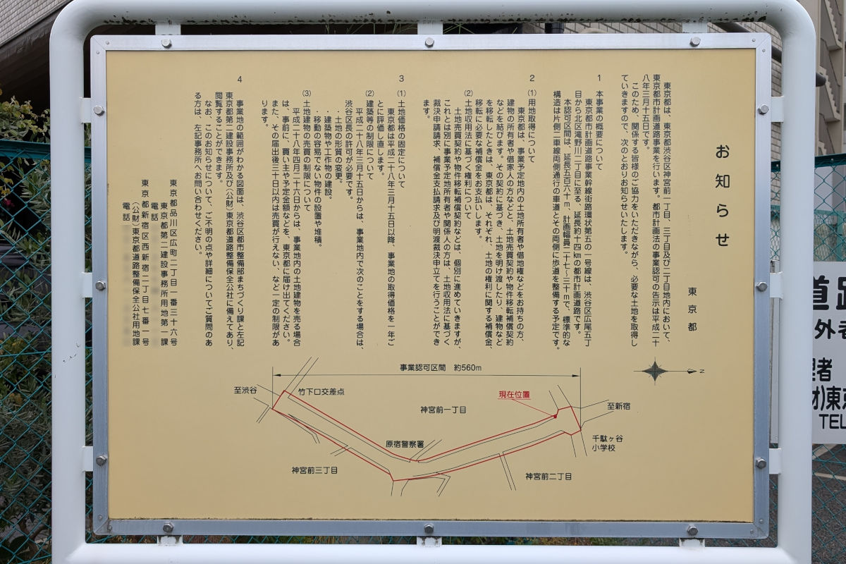 環状第5の1号線は渋谷区広尾五丁目から北区滝野川二丁目に至る延長13,920mの都市計画道路です。このうち、上記図で示す区間では「神宮前Ⅱ期」区間として事業が行われています。