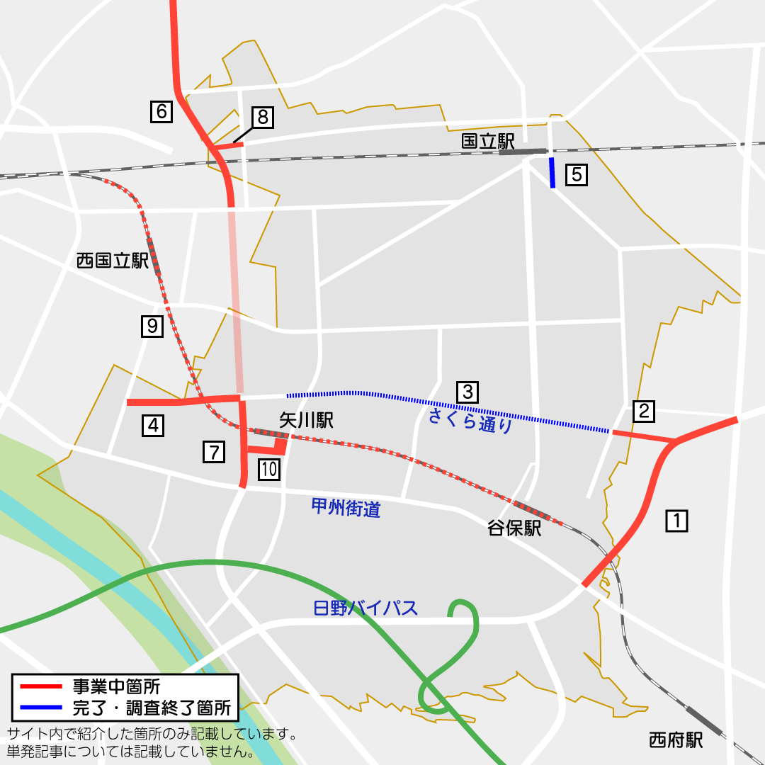 府中市及び国立市で事業が行われている府中3・4・5号新奥多摩街道線及び国立3・4・5号立川青梅線の進捗状況を見てきました。引き続き用地の取得が行われています。事業概要事業概要はこちらこの枠内の情報は随時更新されます。記事本文の情報と枠内の情...