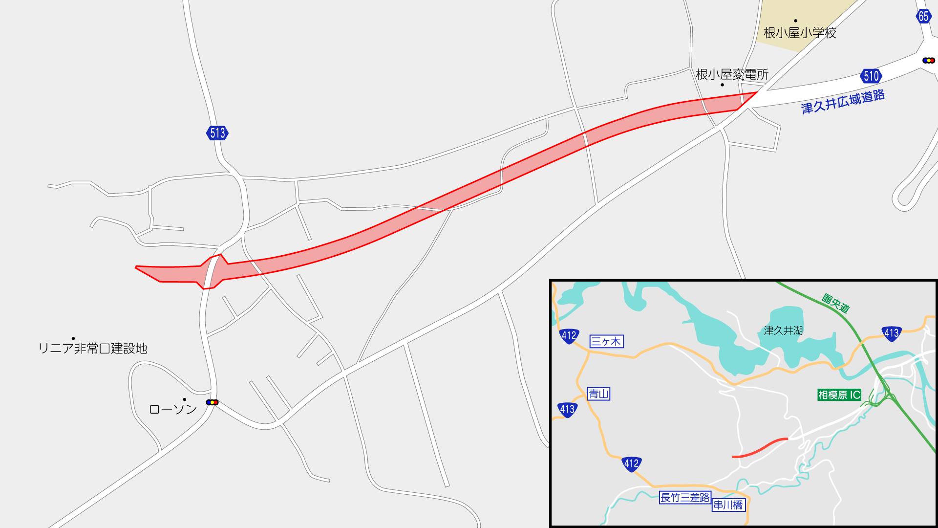 相模湖津久井3・3・1号城山津久井線は、相模原市緑区根小屋から相模原市緑区青山に至る延長約4,500mの都市計画道路です。このうち上記で示した区間では、道路を新設する事業を行っています。